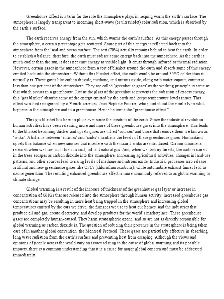 This is a type of greenhouse effect. Due to more greenhouse gases in the atmosphere, more heat is trapped which makes the Earth warmer. Global warming is the biggest threat being faced by mankind today. I believe the world is being faced with a serious issue of global climate change due to the greenhouse effect. The greenhouse effect is a naturally occurring process in the Earth's atmosphere that warms the planet. Without the greenhouse effect, on average, greenhouse effect essay, the Earth's surface would be about 60oF colder. The greenhouse effect occurs when visible light from the sun passes through the atmosphere and is absorbed by the Earth's greenhouse effect essay. Some of that energy is then sent back to the atmosphere as heat.